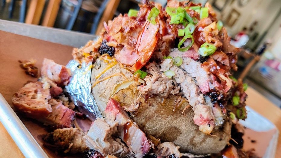 Baked potato with butter, sour cream, bacon, cheese, chives and your choice of meat.