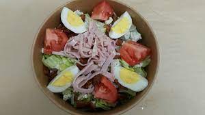 Iceberg lettuce, bacon, blue cheese, tomato, and boiled eggs with ranch. Served with a fruit cup, dessert and beverage.