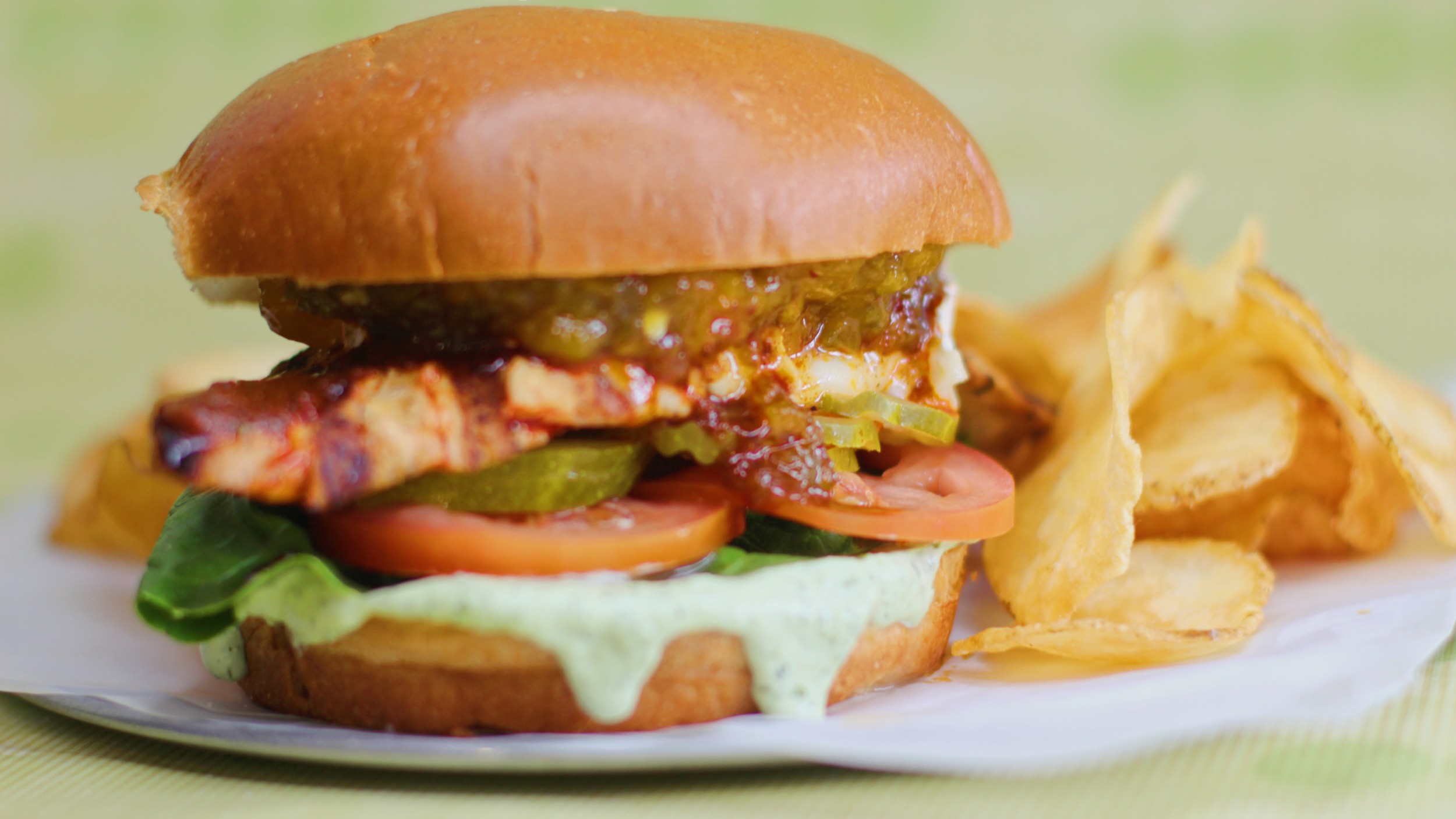 Crispy chicken breast, lettuce, tomatoes, pickles, cilantro pesto, and Nashville hot sauce served on a Brioche Bun.