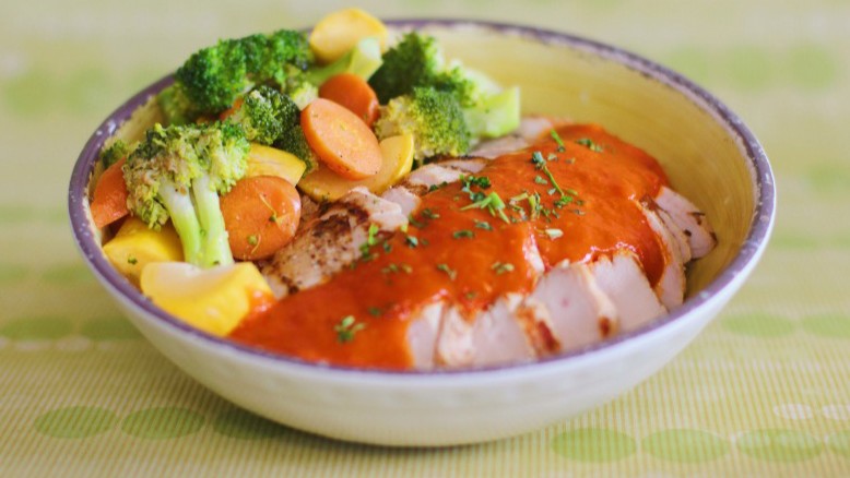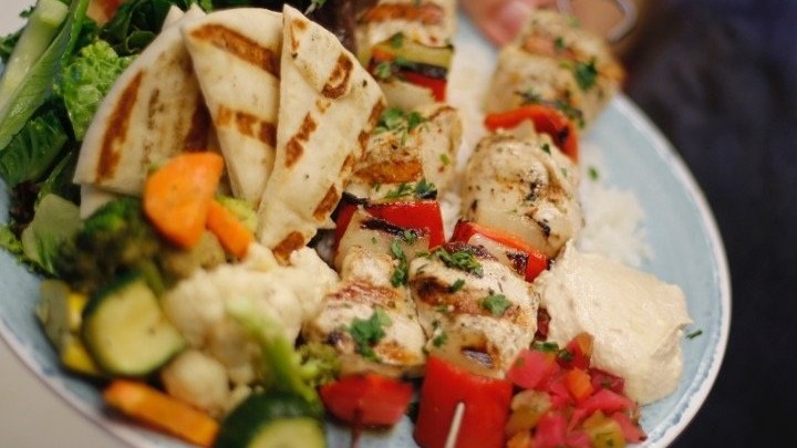 Grilled chicken, roasted veggies, Lebanese hummus, pickles and Tahini sauce.