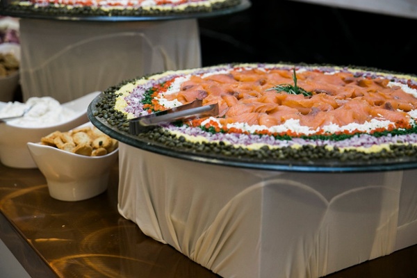 (SERVES 8-12) Smoked slamon display includes atlantic smoked salmon with whipped cream cheese, chives, red onions, capers, chopped egg and crispy bagel chips.
