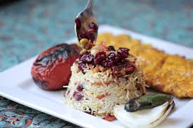 Eggplant stew served with basmati rice, shirazi salad and pita bread.