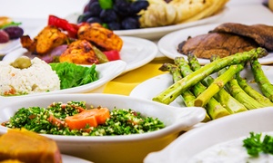 Grilled seasonal veggie kabob served with rice, veggies, salad, dip and pita.