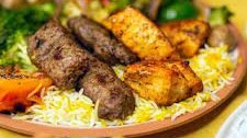Ground beef kabob served with rice, veggies, salad, dip and pita.