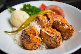 Grilled chicken breast kabob served with rice, veggies, salad, dip and pita.