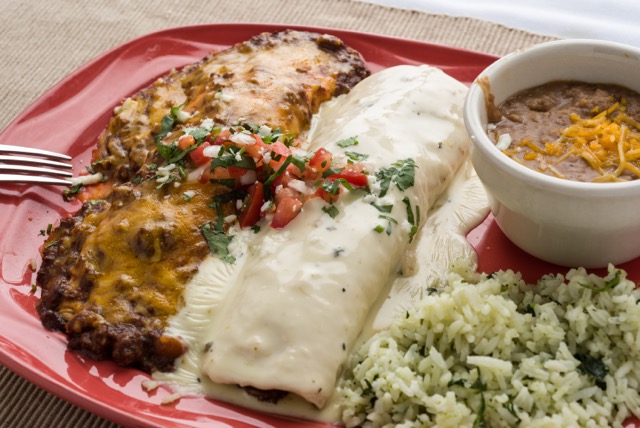 Served with rice, beans, chips and salsa.