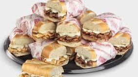 (Serves 10) Includes 16 - 3" chicken and provolone cheesesteaks with mayo, mustard, lettuce, tomatoes, pickles, and grilled mushrooms, onions, and peppers on the side. Served with ten packages of ...