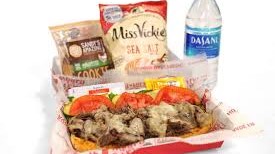 Steak cheesesteak with provolone, grilled mushrooms, onions, and peppers, lettuce and tomato with mayo and mustard on the side. Served with chips and a cookie.