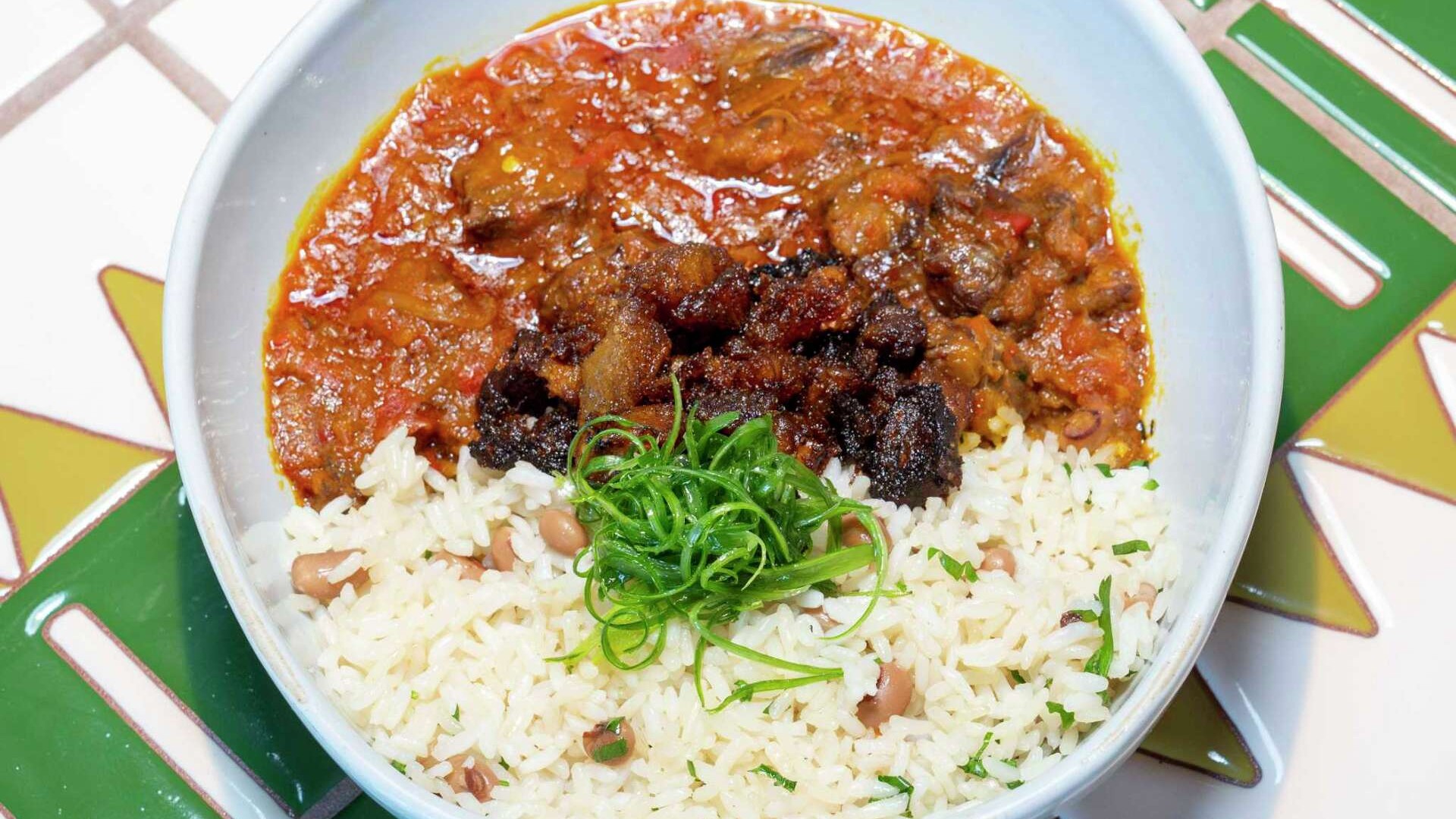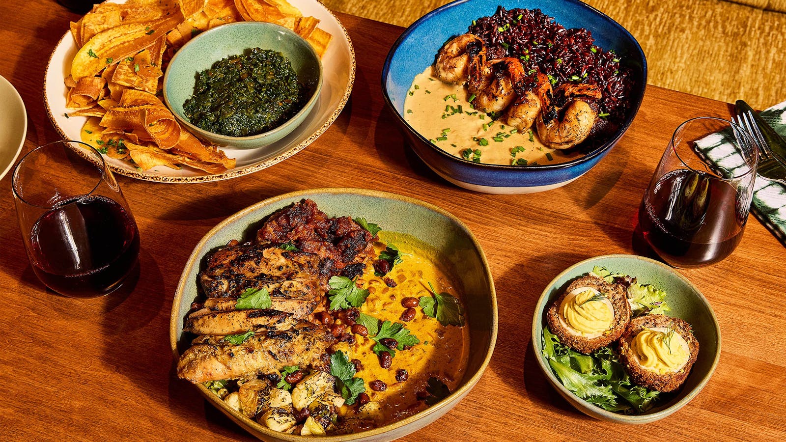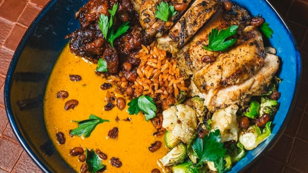 Smokey jollof jambalaya, motherland curry, Blok chicken, yaji vegetables, stewed plantains.