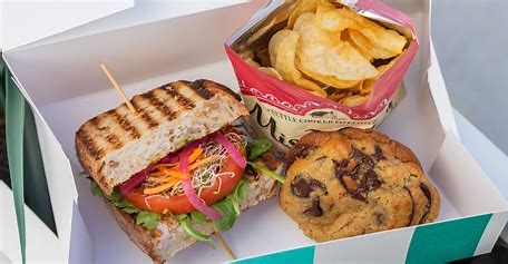 Avocado, tomato, basil-parsley pistou, sprouts, arugula, pickled red onion, carrots, rye bread. Served with sea salt kettle chips and a chocolate chip cookie.