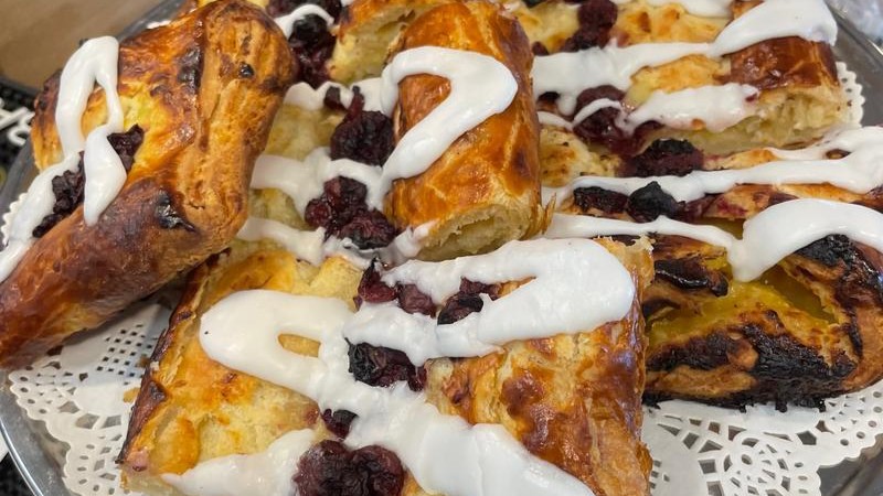 (Serves 4-6) Danish pancakes with Nutella, jam and a small fruit cup.