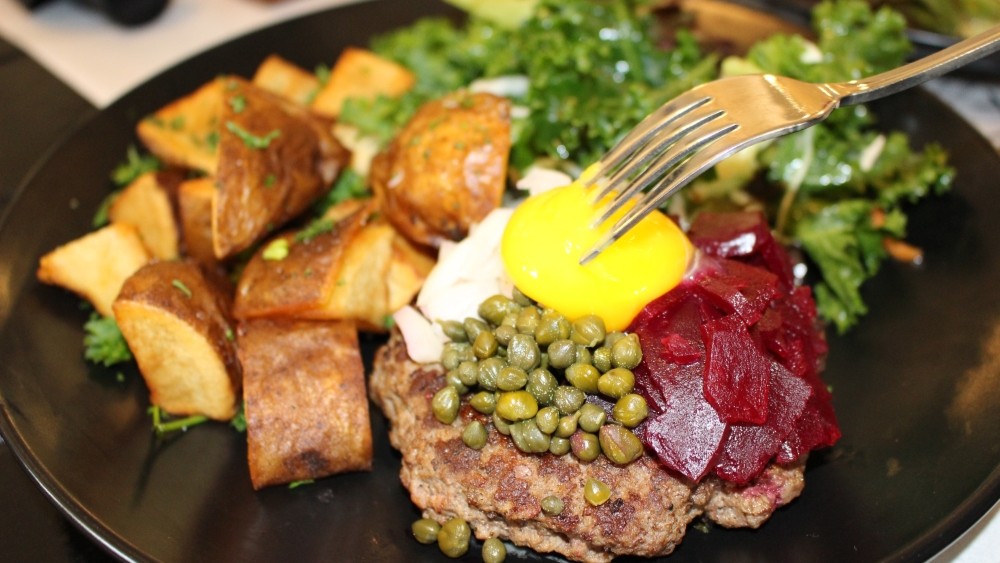 (Serves 4-6) Chopped potatoes, onion and assorted meat. Pan fried together with sun dried tomatoes, kale and parsley pesto. Served with pickled beets and fried eggs.