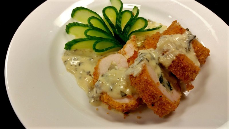 (10 MINIMUM) Breast of chicken stuffed with spinach, red onions, mushrooms, garlic and feta cheese, topped with chardonnay cream sauce. Served with freshly baked dinner rolls, butter and your choi...