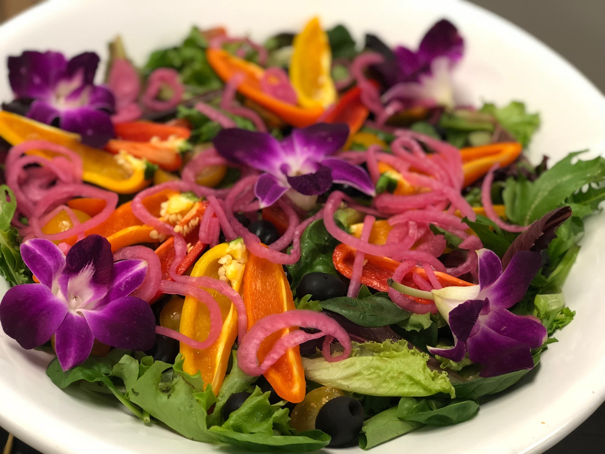 (Serves 8-10) Mixed leaf lettuce, roasted tomatoes, pickled red onions and cucumbers, served with a balsamic dressing.