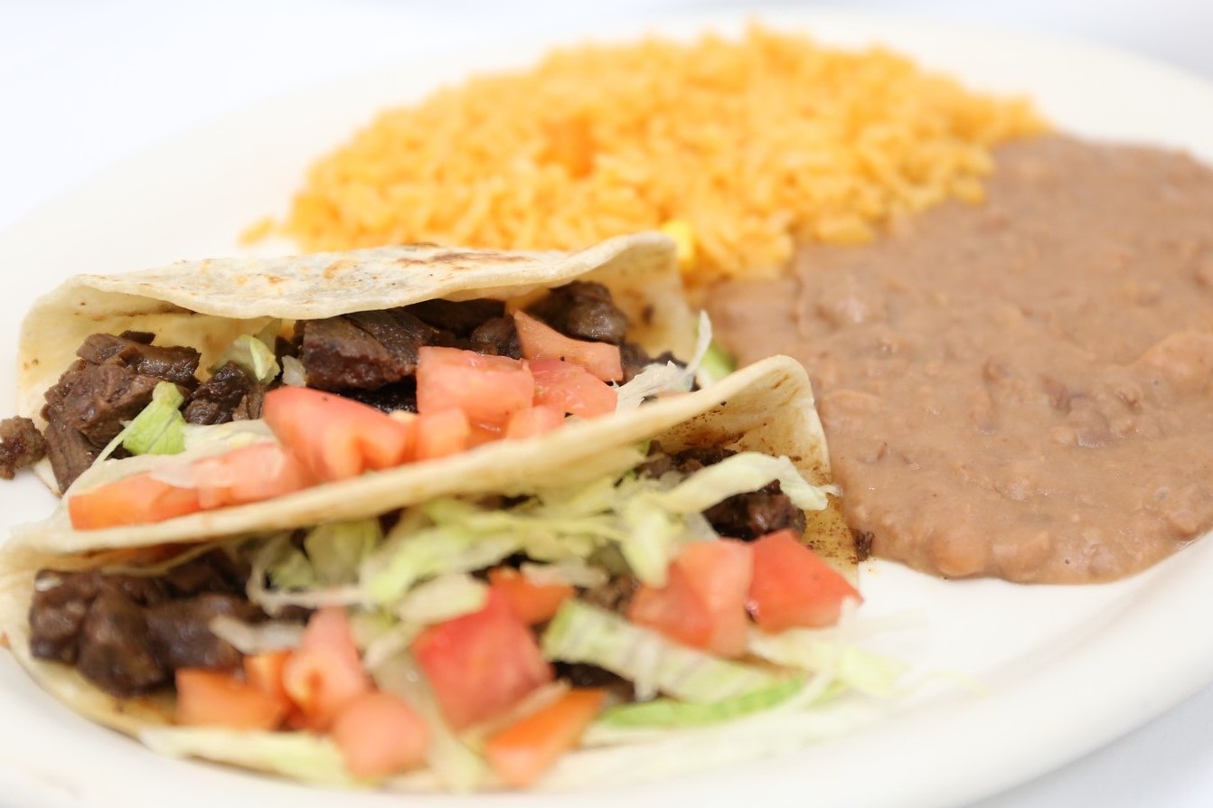 Two flour tortillas, beef or chicken fajita meat diced and served with refried beans, Mexican rice, sour cream, shredded cheese, diced tomatoes, shredded lettuce, and salsa.