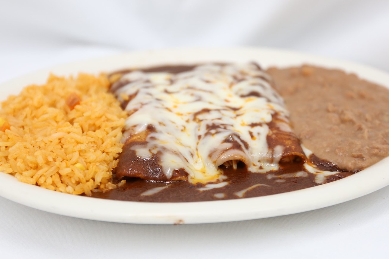 (Per dozen) Stewed chicken or Monterey jack enchiladas topped with a dark rich mole sauce and Monterey jack cheese, served with refried beans, Mexican rice and chips & salsa.