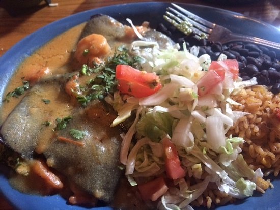 Two spinach and cream enchiladas topped with a meatless green sauce and melted cheese. Served with chips, salsa, rice, vegetarian black beans.