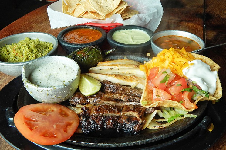 Beef filet mignon fajitas served with chile con queso, guacamole, pico de gallo, sour cream, cheddar cheese, pickled jalapenos, red and green salsa, tortilla chips, grilled onions, and handmade tor...