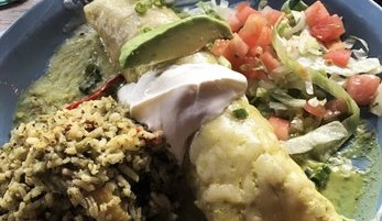 (Per Person) Two spinach enchiladas served with chips, salsa, rice, and beans.