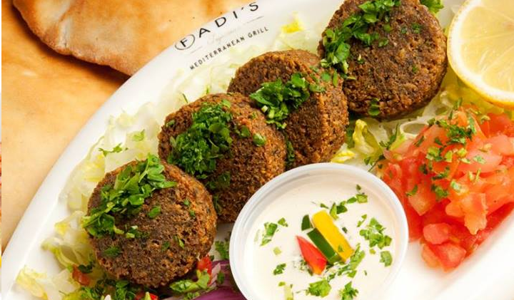 Falafel over rice served with Greek salad, hummus, pita and beverage.
