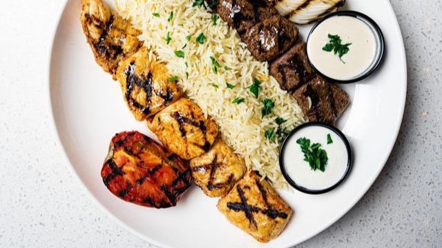 One entree of your choice, plus rice, 4oz of hummus, Greek salad, baklava & pita.