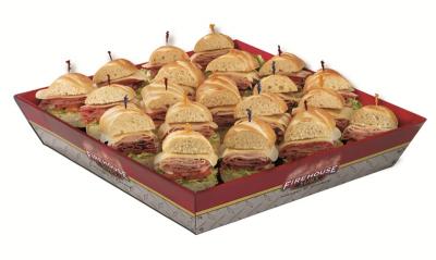 (SERVES 5) Ten 3" sub sections with your choice of meat, served with provolone and pickles on the side, five bags of chips, five cookies and gallon of tea.
