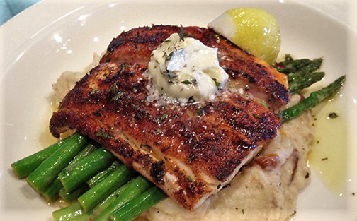 Blackened rainbow trout served with garlic wilted spinach and white rice.