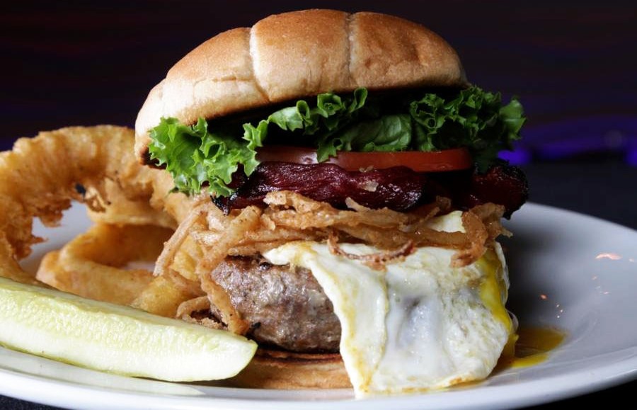 Prime angus patty topped with beef bacon, fried egg, crispy onion strings and cheddar cheese on a pretzel bun.