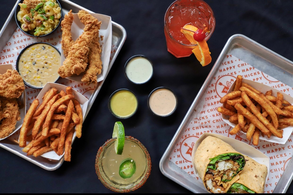 6 Chicken Tenders, 2 Happy Sauces, served with Roasted Cream Corn, Bacon Mac and Cheese and Fries