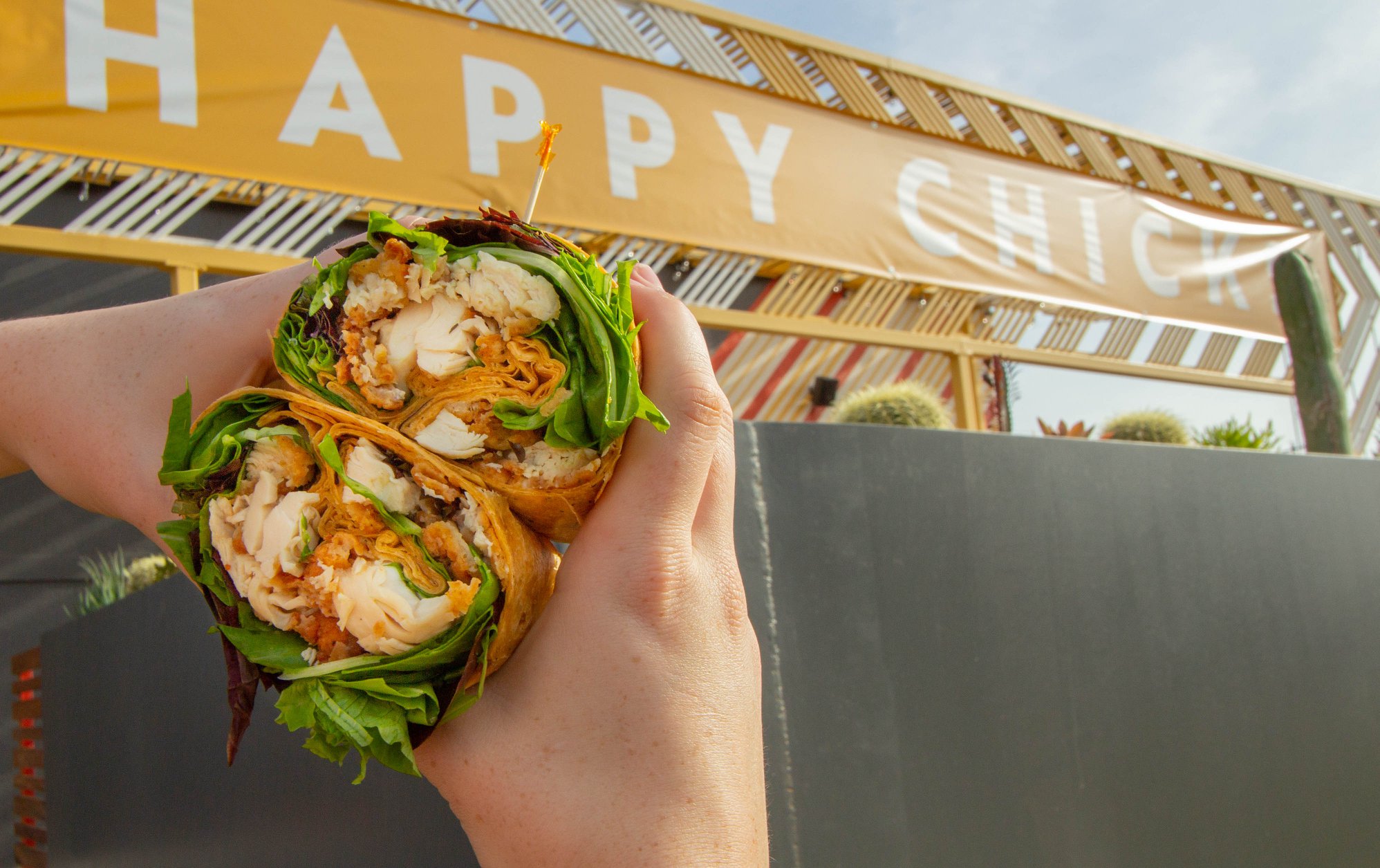 3 Chicken Tenders wrapped with Field Greens, Happy Sauce in a Sun-Dried Tomato Tortilla. Served with Fires