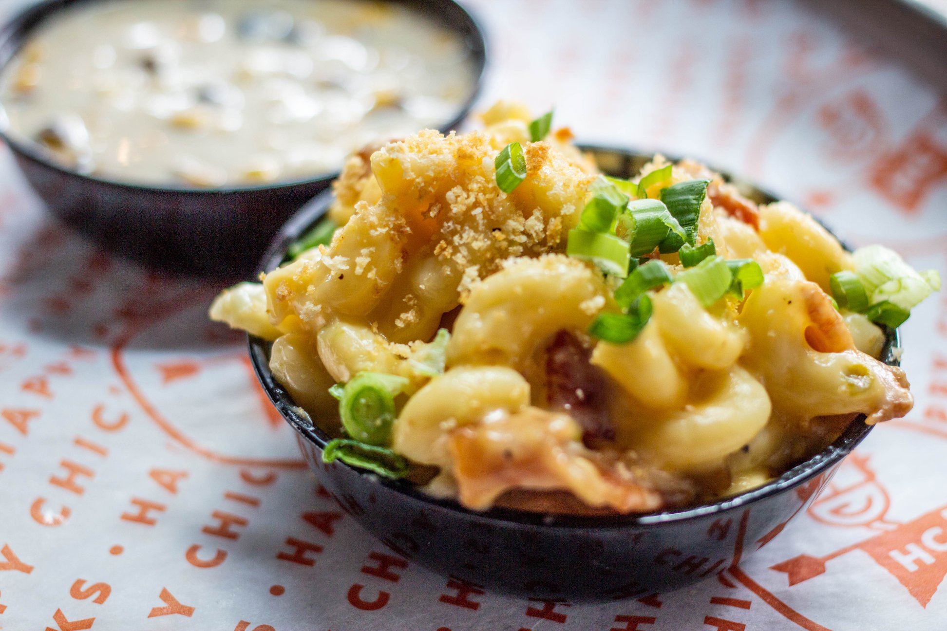 4 Chicken Tenders, 2 Happy Sauces, served with Roasted Cream Corn, Bacon Mac & Cheese and Fries.