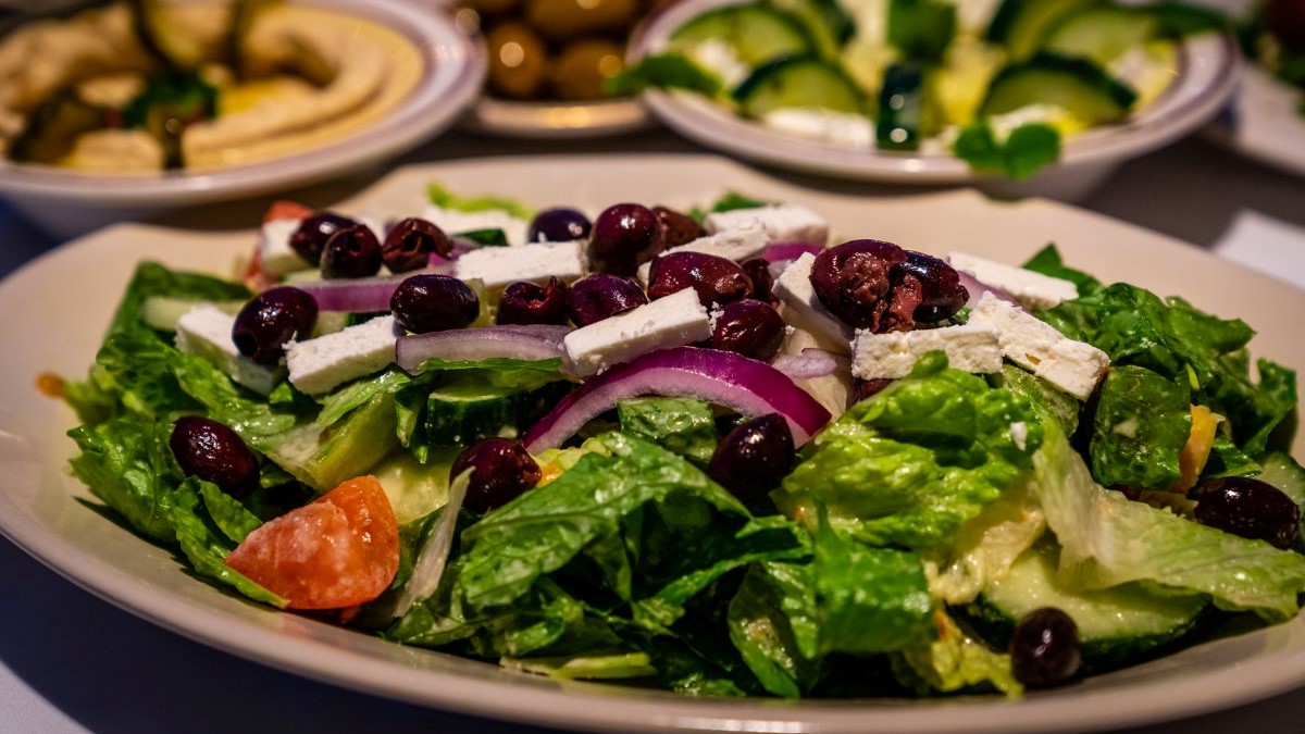 A mix of romaine lettuce, cucumber, tomato, kalamata olives, onions and feta cheese, served with a mamoul cookie.