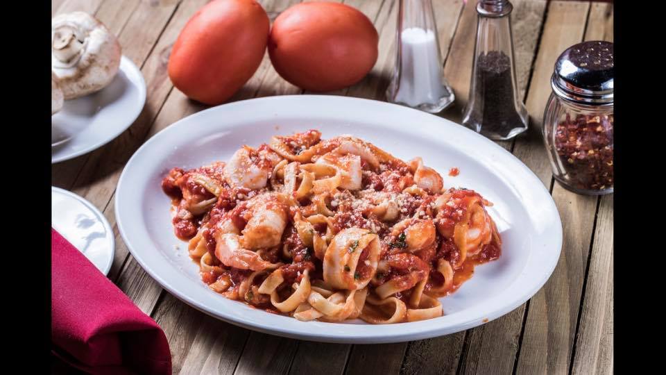 Shrimp, crab meat, scallops, tomatoes and linguine, topped with a spicy calm sauce. Served with a side salad.