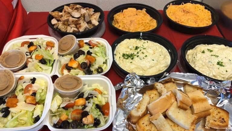 Fettuccine pasta and chicken in a creamy Alfredo sauce. Served with a cup of soup or side salad.