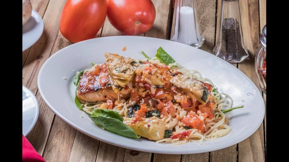 Grilled salmon, tomatoes, artichoke hearts, spinach and angel hair pasta, topped with a lemon butter sauce. Served with a side salad.