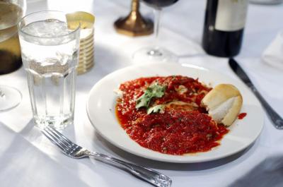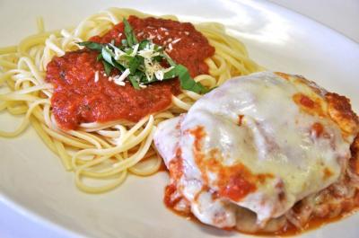 (SERVES 6) Breaded, sliced eggplant, melted mozzarella cheese, served with penne pasta and topped with red tomato sauce.