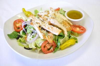 (SERVES 6) Spiral tri-colored pasta with red onions, pepperoncinis, black olives, tomatoes and shredded Parmesan cheese with grilled chicken. Served with homemade Italian dressing on the side.