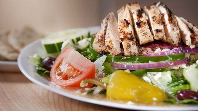 Lettuce, tomatoes, onions and tzatziki. Served with a side and bread of your choice.