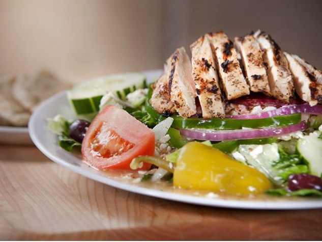Lettuce, tomatoes, onions and tzatziki. Served with a side and bread of your choice.