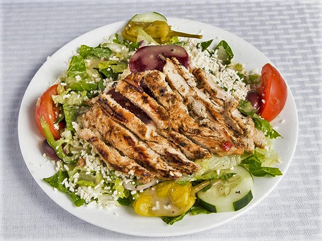 Freshly cut romaine and iceberg lettuce mix, tomatoes, cucumbers, red onions, green peppers, olives, pepperoncini peppers topped with potato salad, feta and beets. Served with warm pita bread.