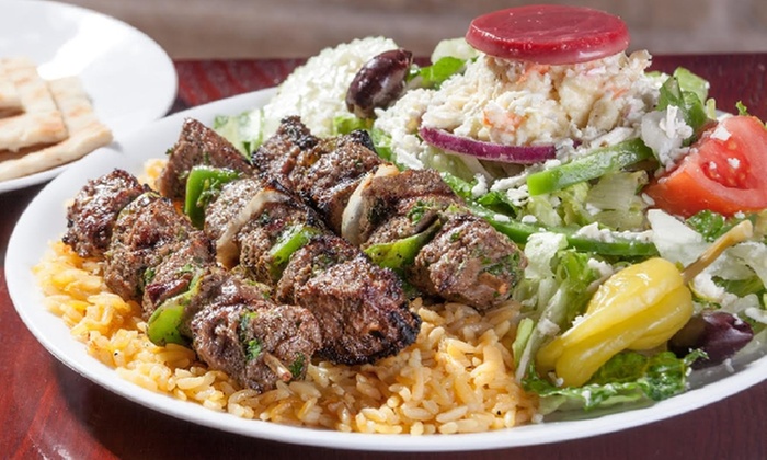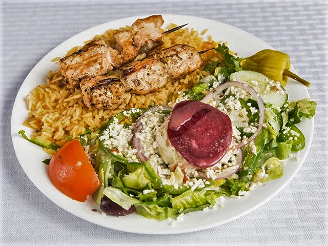 Two char grilled skewers with Greek salad. Served with rice, pita bread and tzatziki sauce.