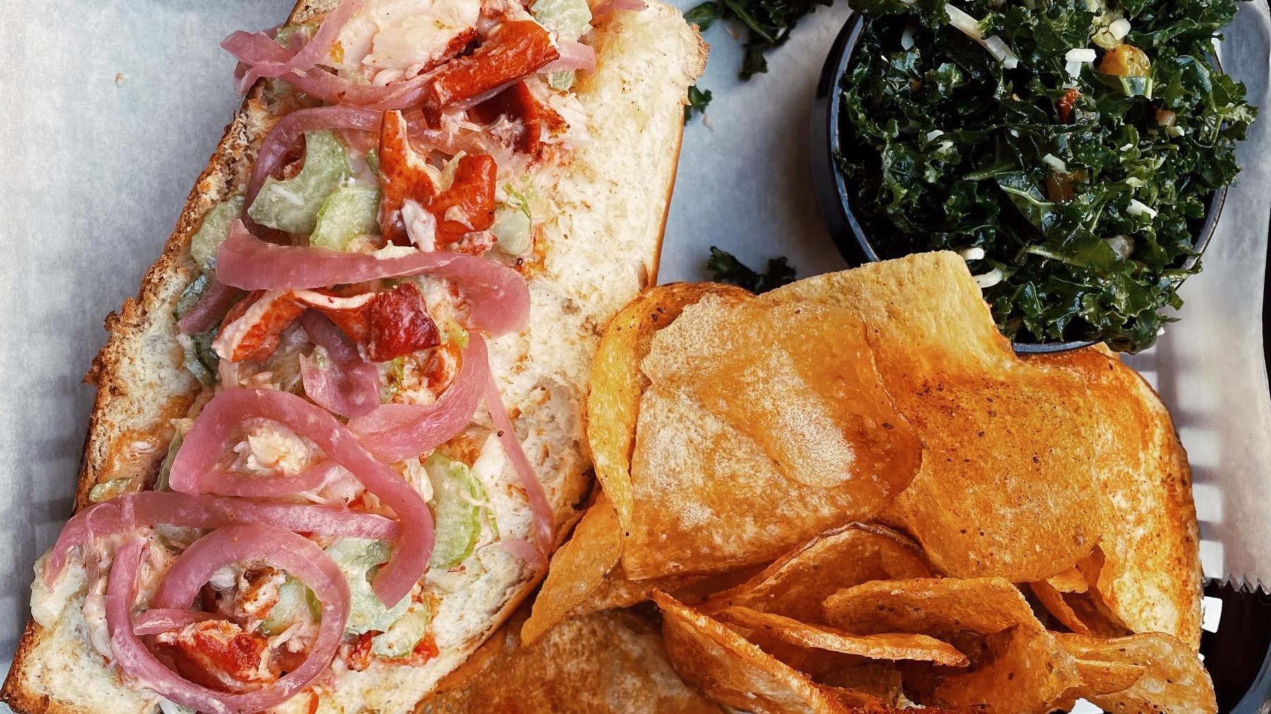 Shrimp, tomato, pickled onion, lettuce, and Green Goddess dressing on ciabatta with your choice of two sides.