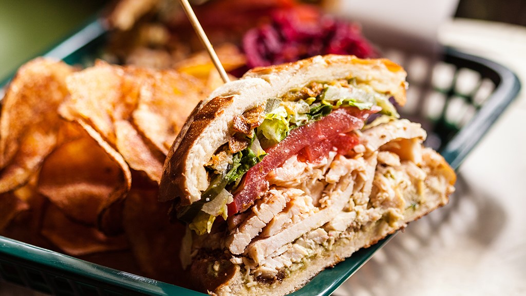 Oven roasted chicken breast, nutseed crumble crushed chips, tomato, house pickles, provolone and buttermilk ranch on a pretzel bun with your choice of two sides.