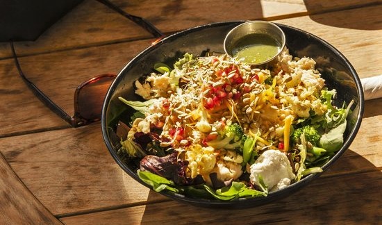 Mixed greens, crispy brussels sprouts, avocado, hummus, pickled onion, tomato, curried cauliflower and alfalfa sprouts.