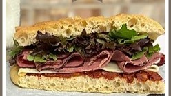 (Serves 10) Includes 10 pieces roasted beef focaccia sandwiches, 10 chocolate crack cookies, one gallon lemonade.