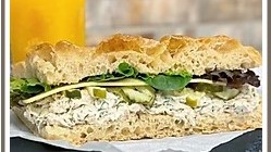 Focaccia bread, tuna salad (mayo, yogurt, dill and garlic), Swiss cheese, crumbled pickles and spring mix. Served with chips.