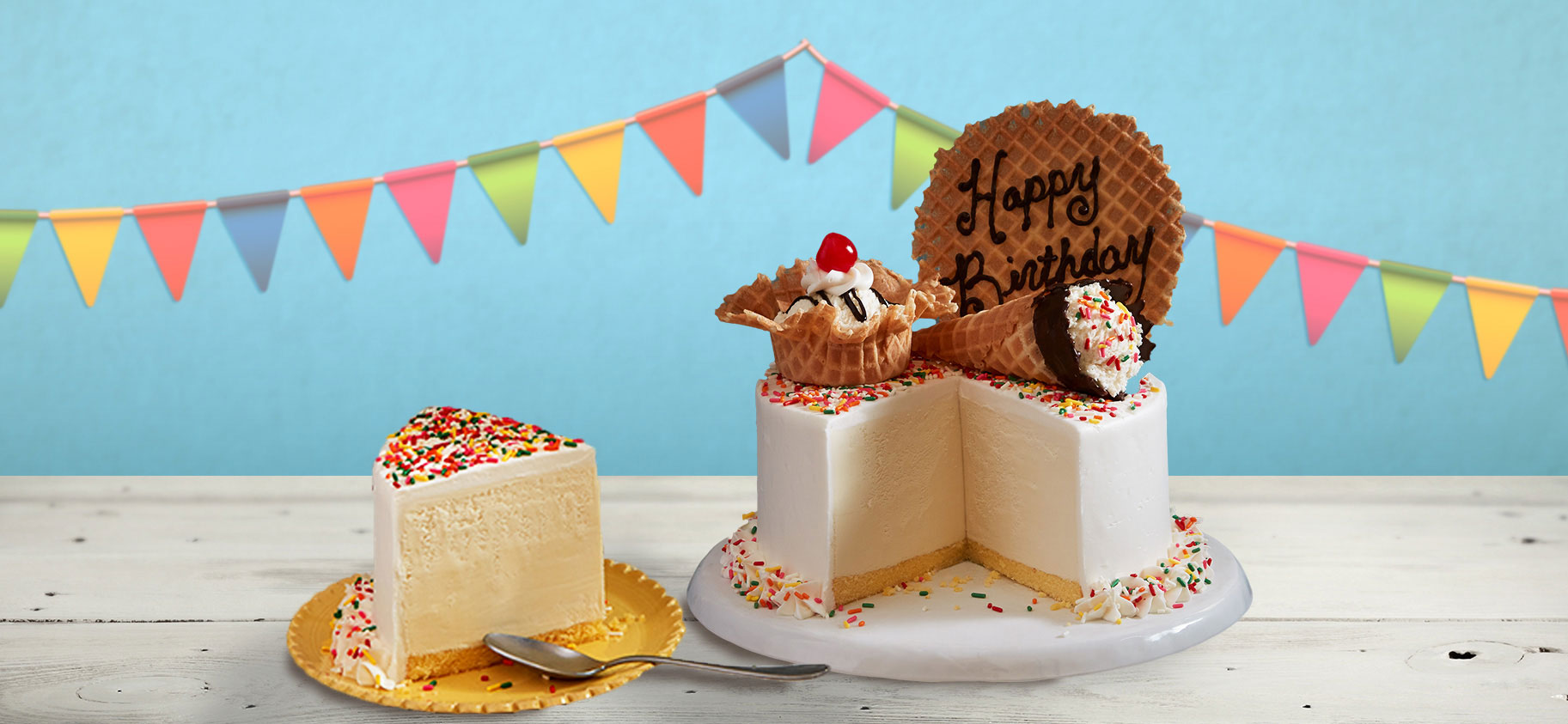 (Serves 20-22) Yellow cake with strawberry puree, vanilla, and birthday cake ice cream.