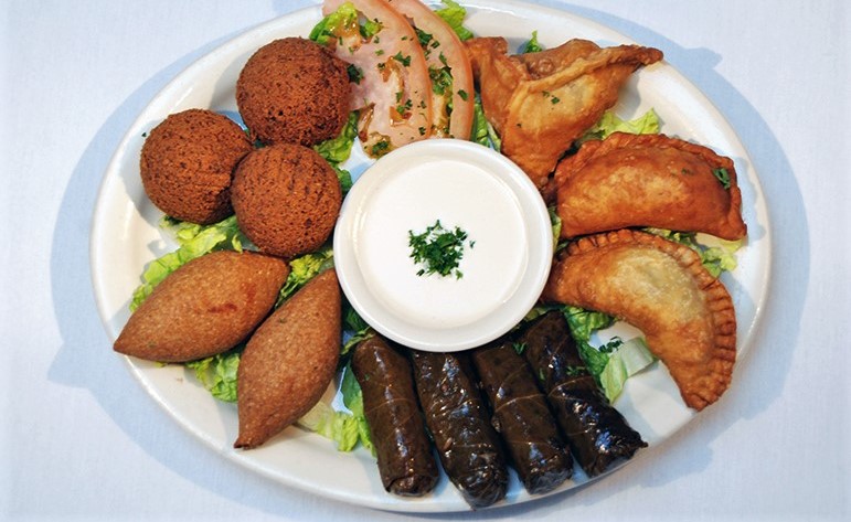 3 falafels, 2 kibbi, 3 pieces of each pie and 4 grape leaves.