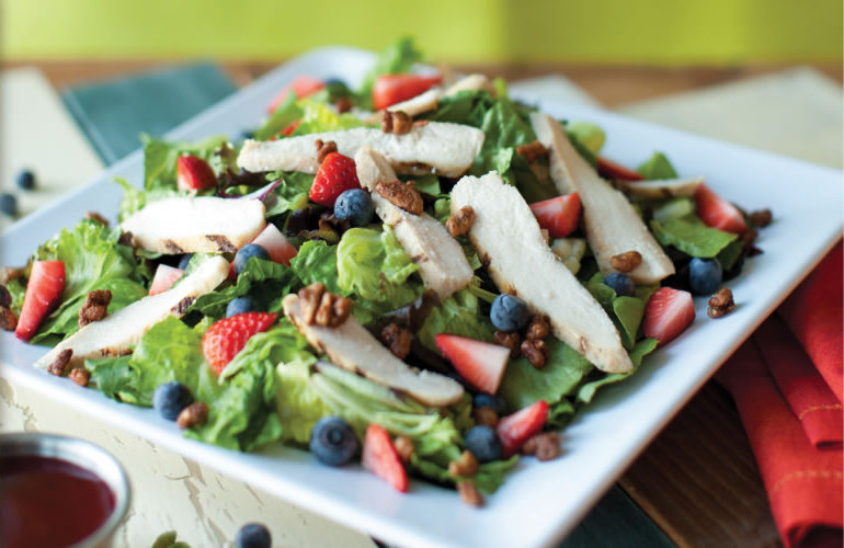 Fresh strawberries and blueberries, candied pecans and grilled chicken, served with Fat-Free Raspberry-Pecan Vinaigrette dressing.