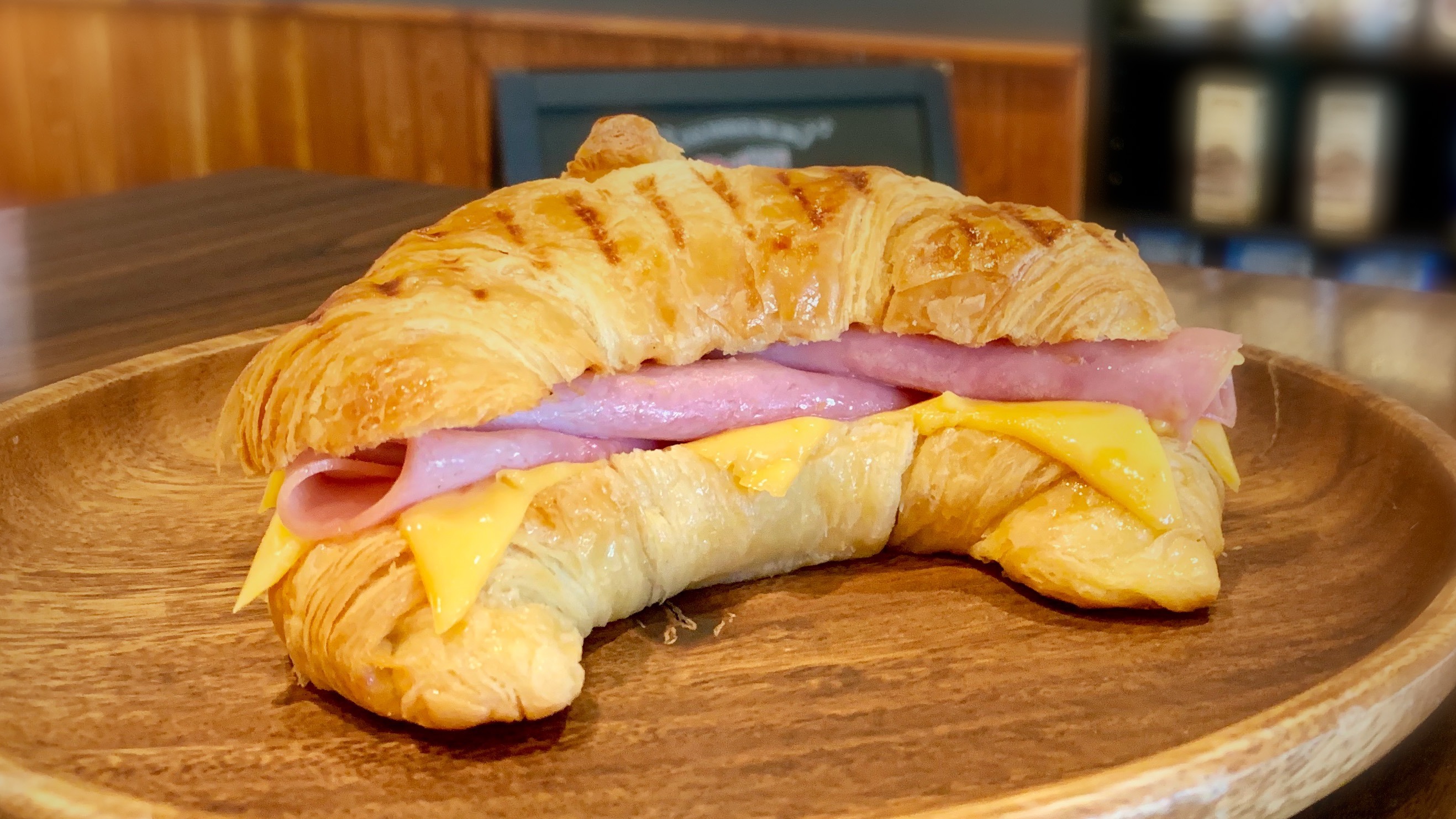 Smoked ham and American cheese on a butter croissant.